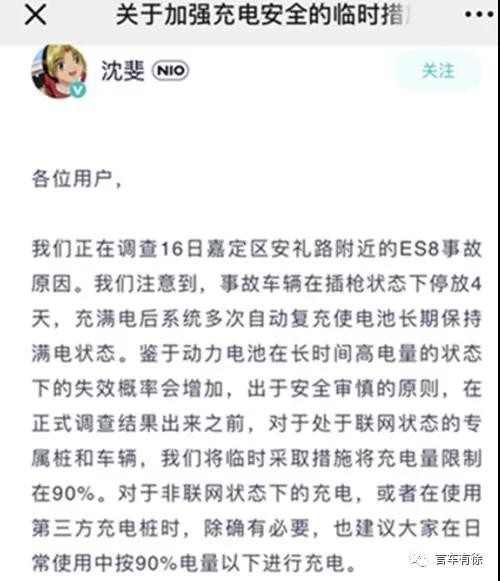 暂将充电量限制在90% 从沈斐的回应来看,出于安全审慎的原则,在正式调查结果出来之前,对于处于联网状态的专属桩和车辆,蔚来将临时采取措施将充电量限制在90%。