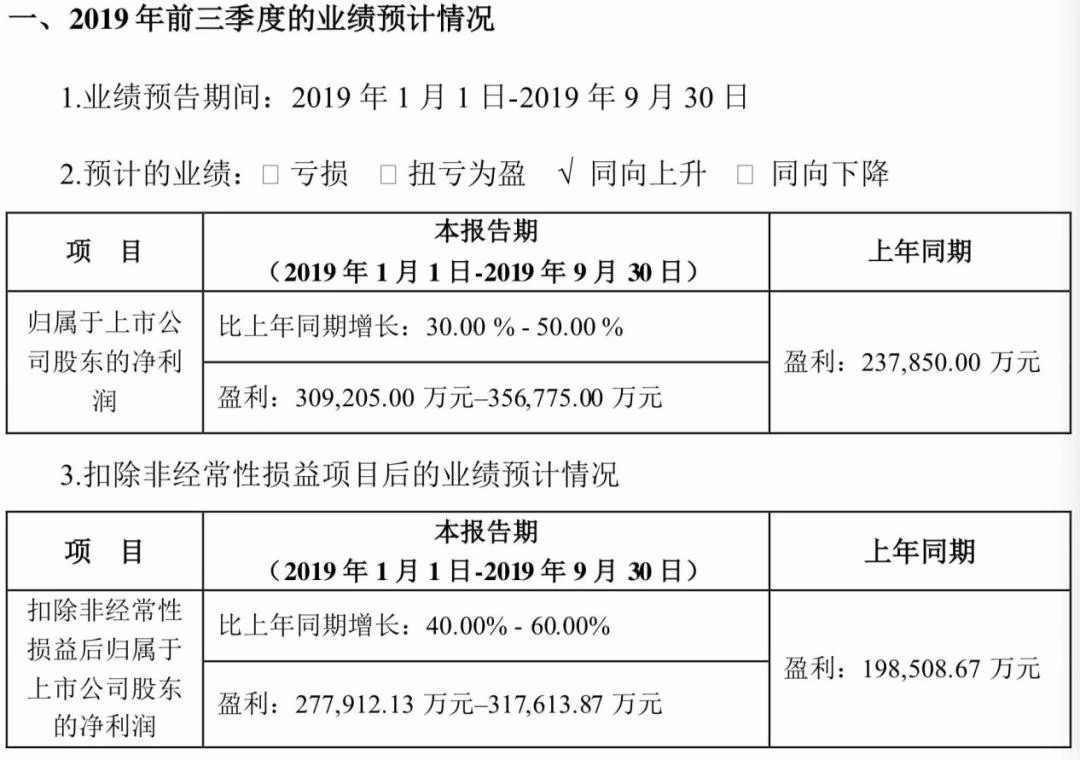 因为根据10月14日,宁德时代发布了2019年前三季度业绩预告。预告显示,截止到9月30日,宁德时代预计今年前三季度归属于上市公司股东的净利润为30.92亿-35.68亿元,相比去年同期的23.79亿元增长了30%-50%。