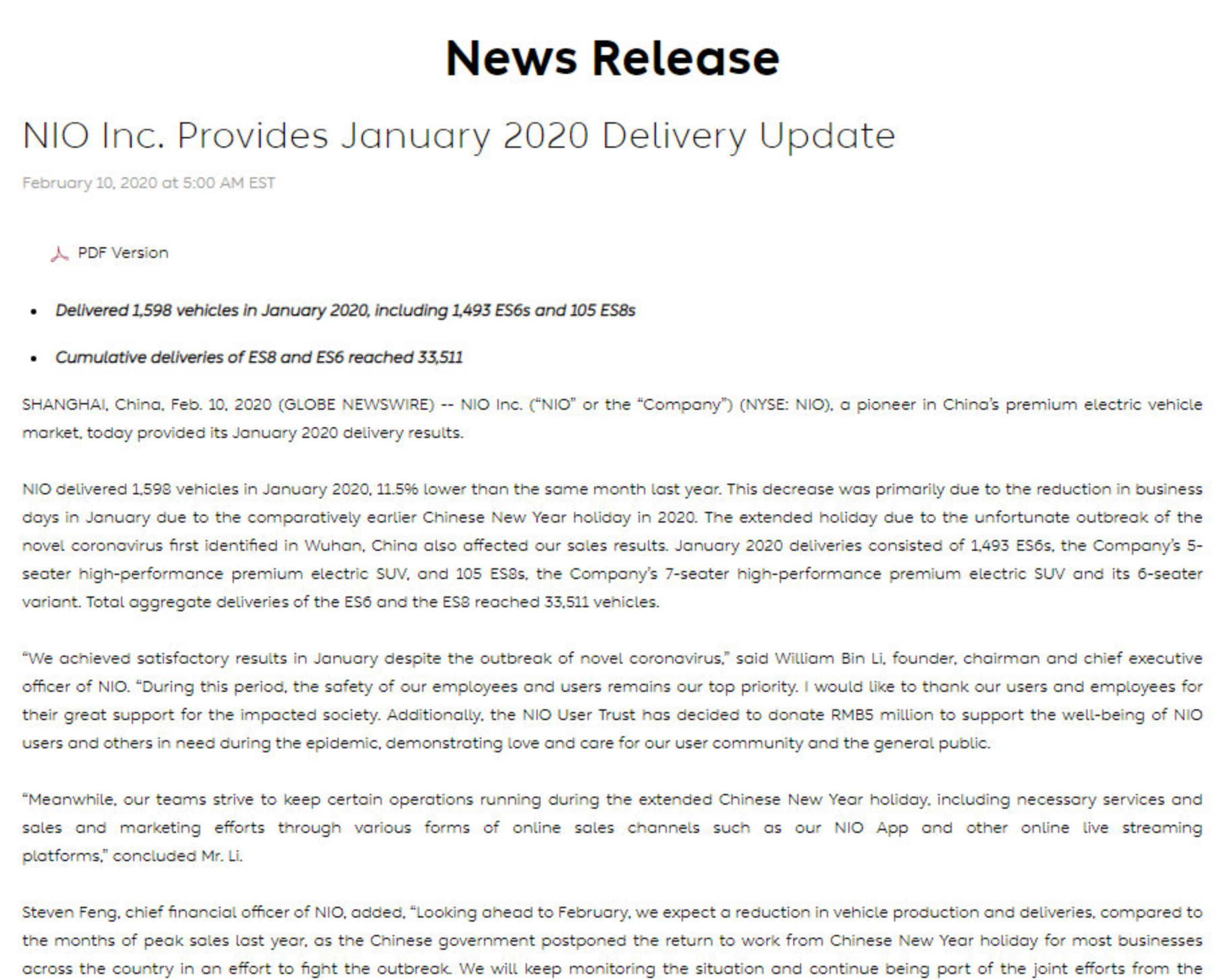 “同时,我们的团队努力在春节长假期间保持一定的运营,包括提供必要的服务,以及通过蔚来App和其他在线直播平台等线上销售渠道进行销售和营销。” 蔚来首席财务官奉玮补充道:“由于政府为控制疫情推迟了节后复工复业的日期,我们预计2月份车辆的生产和交付相比过去几个月的高峰会有一定下降。我们将持续关注疫情的发展,并继续与中国政府,及国内外各界共同努力,抗击疫情。”