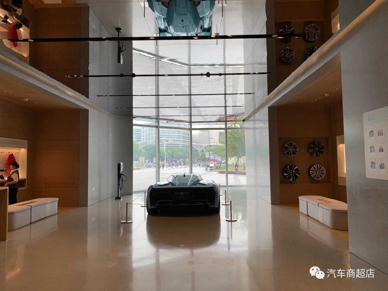 进了展厅,是墙面和地面一色的装修风格,顶部采用了全镜面,这样的风格,营造了更大的空间感。展厅面积估计有三四百平方米,但只摆放了四台车,地面上除了车和两个沙发长凳基本没放置其它东西,墙面上的布置也非常少,空间的空旷感营造得相当不错。这样做的好处是非常有利于顾客一下子就把眼睛关注到展车上。
