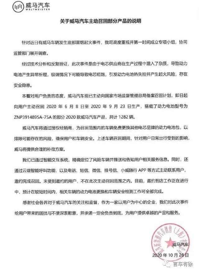 由于频繁的自燃,让威马不得不实行大规模的召回,据悉,威马将在10月28日起,召回2020年6月8日至2020年9月23日生产的,装备了电芯型号为ZNP3914895A-75A的动力电池的部分2020款威马EX5电动汽车,共计1282辆。