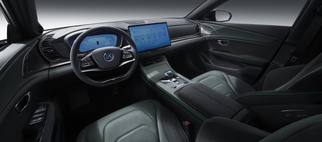 第一眼看到汉EV千山翠限量版,其高级而深邃的视觉观感便给人留下了深刻的印象,配色灵感取自程俱《三峰草堂》中“雨洗千山翠欲浮,稻畦松涧已争流”,仔细看漆面带有璀璨的细闪,在深暗基调的衬托下更添颗粒的立体闪烁折射效果。灯光照射下,冷翠青色看起来既有高冷格调,又有些许灵动。从配色上,汉EV千山翠限量版可以说将中国山水点翠绘画的翠青色调意境与汽车设计结合得淋漓尽致,融合了国潮的韵味和现代工艺,别具一格。