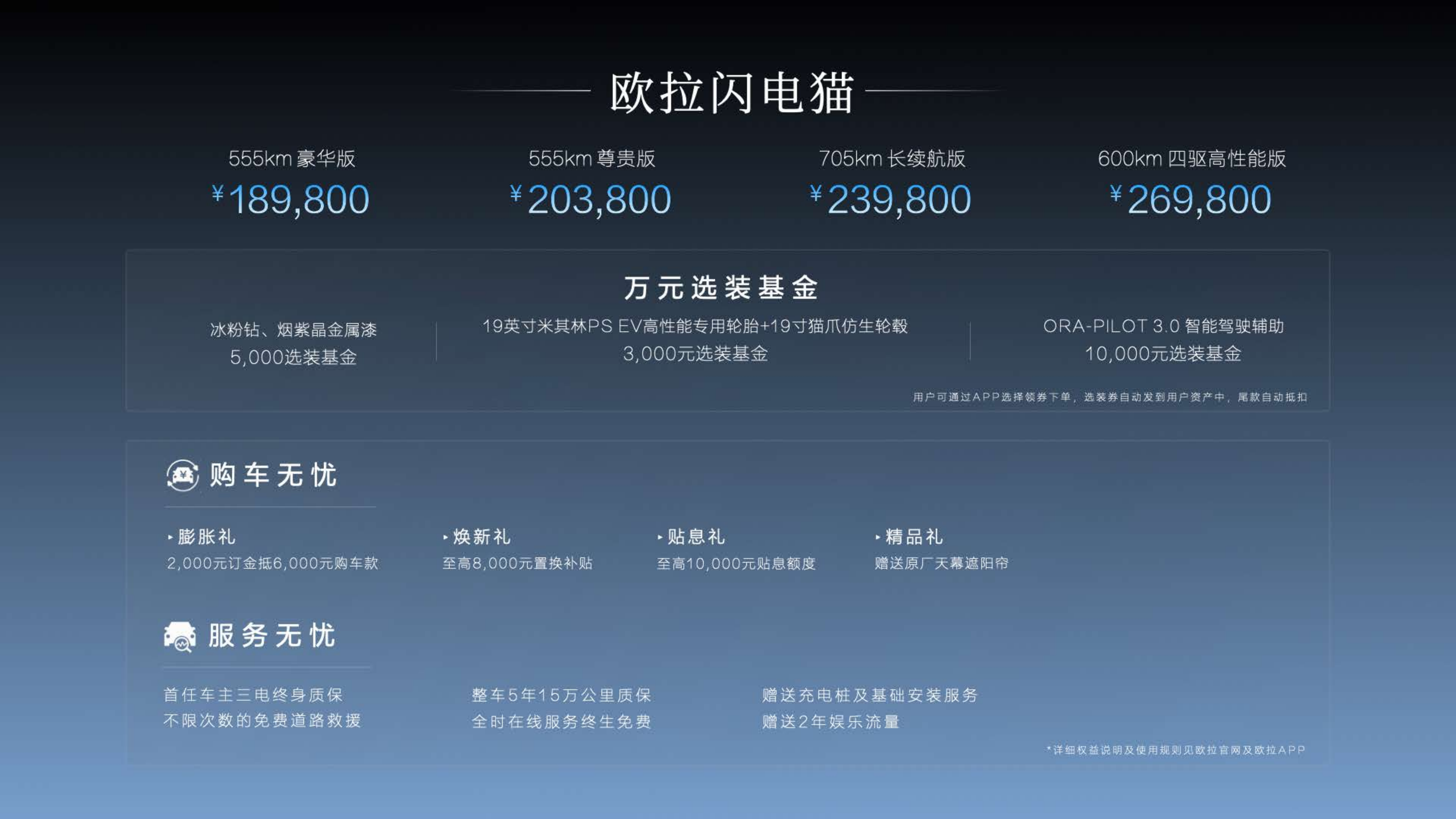 本次发布会,欧拉闪电猫公布四款车型,分别为600km四驱高性能版,综合补贴后售价26.98万元;705km长续航版,综合补贴后售价23.98万元;555km尊贵版,综合补贴后售价20.38万元;续航555km豪华版,综合补贴后售价18.98万元。此外还包含“无忧购车”、“无忧用车”、“选装折扣”三重惊喜上市权益。诚意十足的价格,让更多的年轻人、家庭用户都可以享受到闪电猫带来的惊艳之旅。