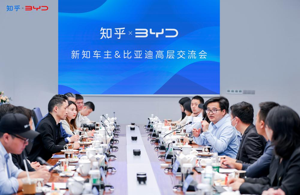 在高层交流会环节,比亚迪品牌及公关事业部总经理李云飞表示:“很高兴与知乎新知车主们一同探讨新能源汽车的未来,比亚迪颠覆性的技术、向上的多品牌战略、全球化的业务布局,将进一步加速新能源汽车对燃油车的替代,助力中国新能源汽车向上发展。同时,知乎作为国内最具影响力的知识分享平台,集聚了上亿高知答主与专业答案,我们希望通过本次面对面的交流,使各位知乎的新知车主成为我们的品牌挚友,并肩共建「科技·绿色·明天」。” 比亚迪品牌及公关事业部总经理李云飞与知乎新知车主一同交流