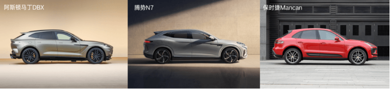 来到侧面,可以看到腾势N7采用了豪华运动车常用的长轴距短前悬的低趴设计,整体风格给人感觉优雅而不失运动感,结合大尺寸的刀锋轮毂,似有一种蓄势待发的既视感,这种低趴的姿态可谓将运动灵魂和优雅气质结合得恰到好处,即便是与保时捷Mancan、阿斯顿·马丁DBX这类百万级豪车运动车相比也毫不逊色,甚至姿态气场更佳。
