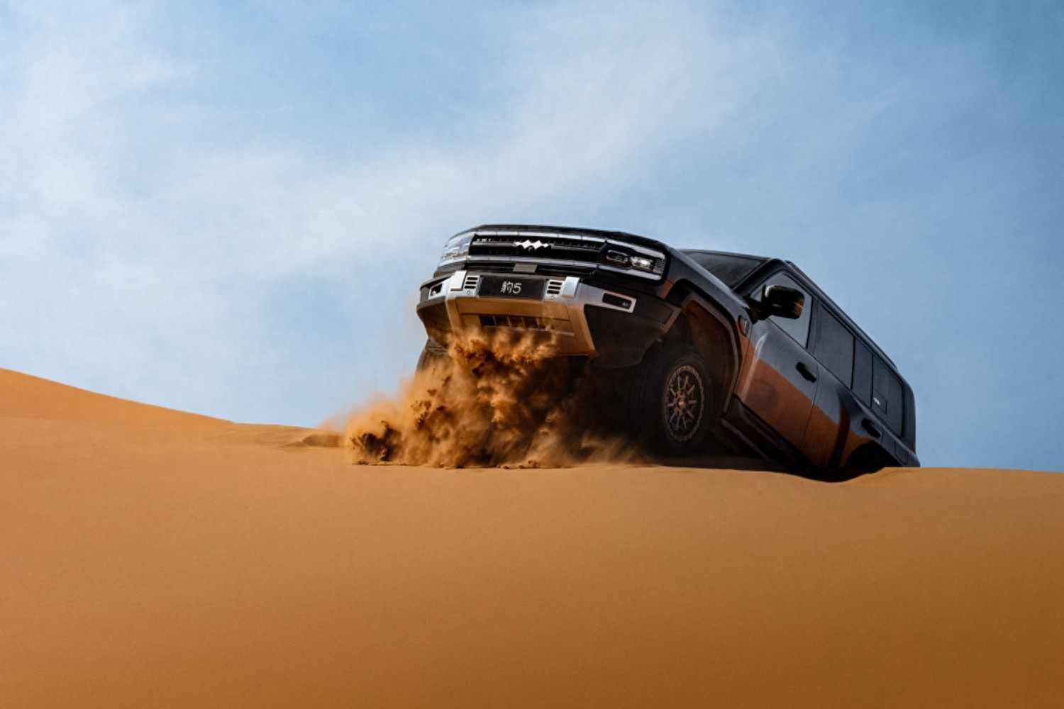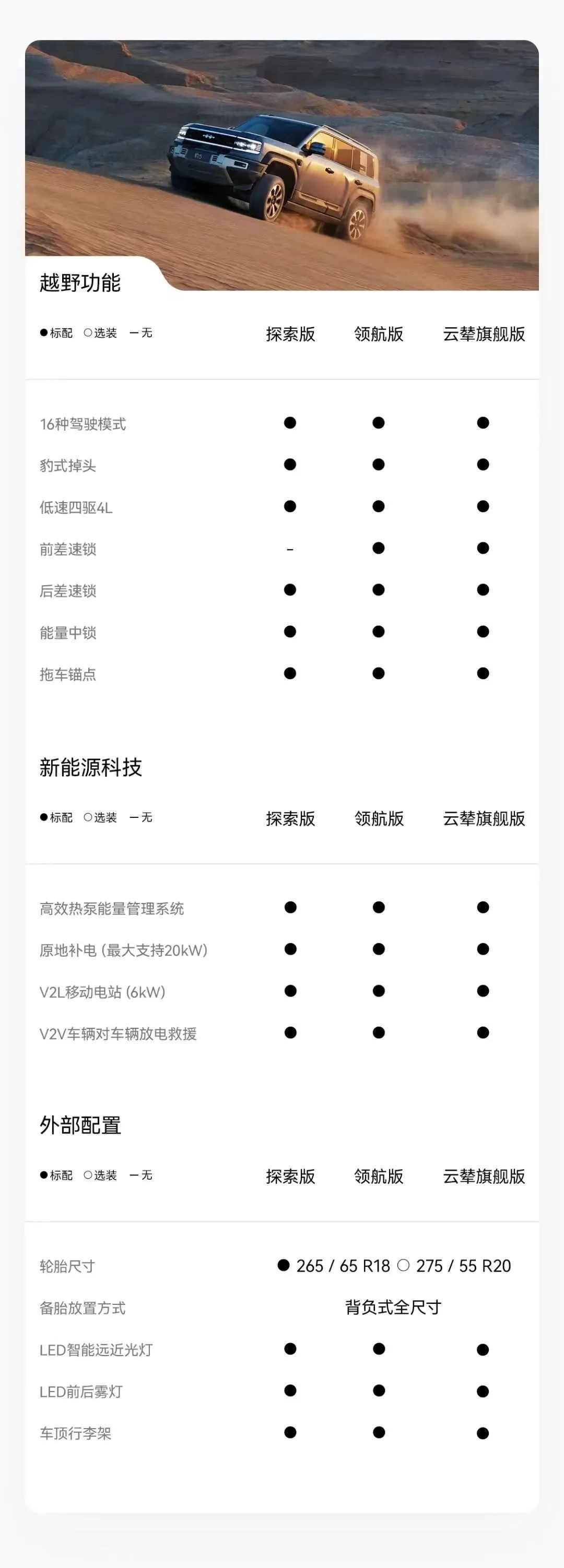 豹5搭载由纵置1.5T高功率发动机与前后双电机组成的插混动力系统,其中发动机最大功率143千瓦,峰值扭矩273牛·米;前桥电机最大功率200千瓦,峰值扭矩360牛·米;后桥电机最大功率285千瓦,峰值扭矩400牛·米;系统综合输出功率505千瓦,综合扭矩760牛·米。豹5的官方0-100公里/小时加速时间为4.8秒,最高车速180公里/小时,综合续航里程可以达到1200公里。 豹5搭载电池组容量为31.8千瓦时,CLTC工况纯电续航里程125公里,NEDC工况馈电油耗百公里7.8升。同时,发电功率为20千瓦,并支持直流与交流充电,直流充电功率最高为100千瓦。豹5还支持V2L和V2V外放电功能,放电功率为6千瓦。 此外,豹5搭载的前后双电机均集成电子差速锁,还配备电中锁,支持低速四驱(4L)模式。通过对前后电机进行分别控制,可实现豹式掉头,可在非铺装路面减小转弯半径。 在越野性能参数方面,探索版和领航版的最小离地间隙为220毫米,接近角为35度,离去角32为度,纵向通过角为20度;云辇-P主动式液压车身控制系统悬架最大调节行程达到140毫米。云辇旗舰版的最小离地间隙有所增加,达到310毫米,所以接近角为39度,离去角为35度,纵向通过角为27度。从数据上看,云辇旗舰版的通过性要优于另两款车型。