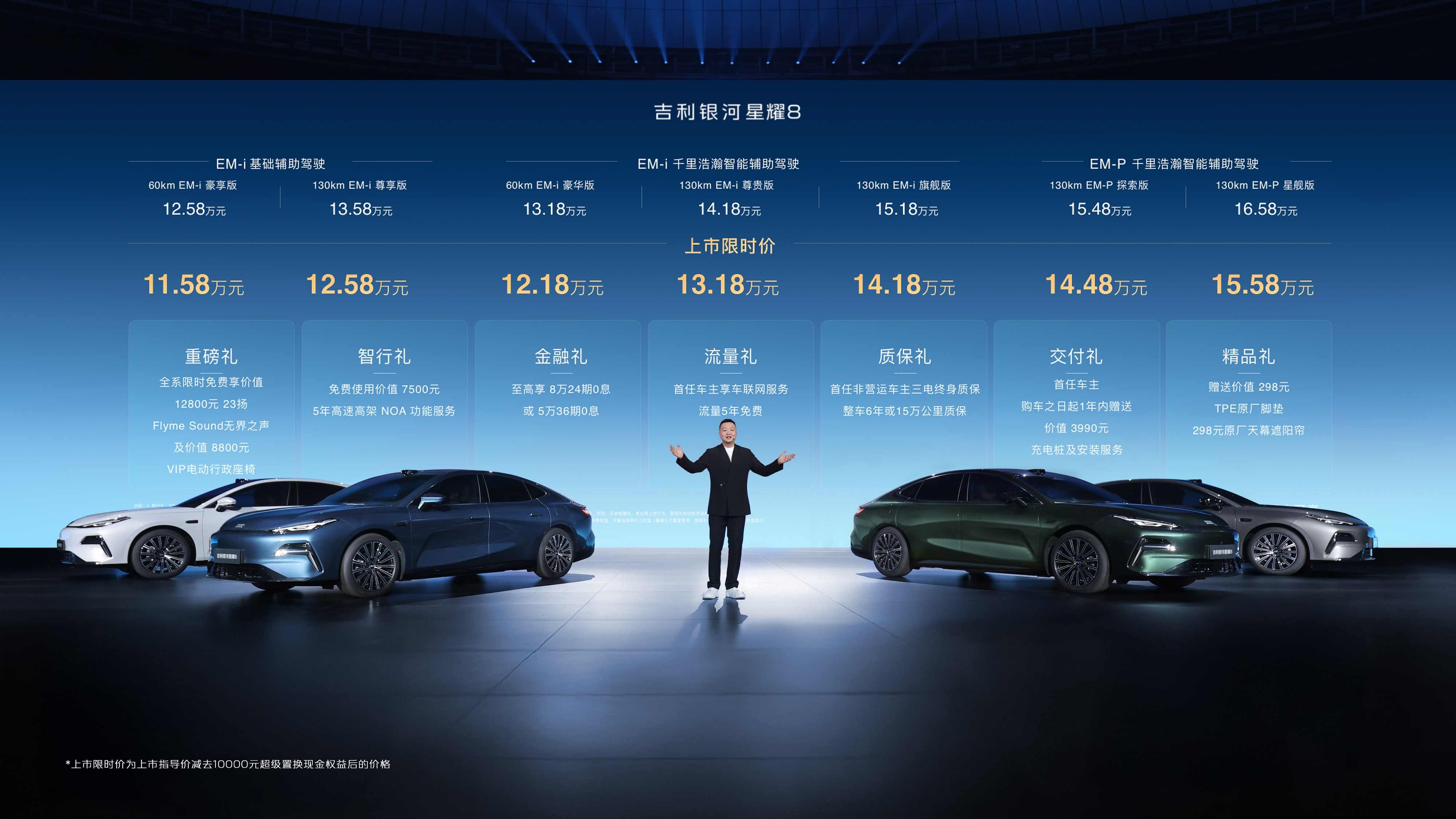 吉利银河星耀8上市限时价11.58~15.58万元(仅限2025年6月30日前,完成大定锁单的用户,可享上市限时价),同时也为用户推出丰厚的限时购车权益。