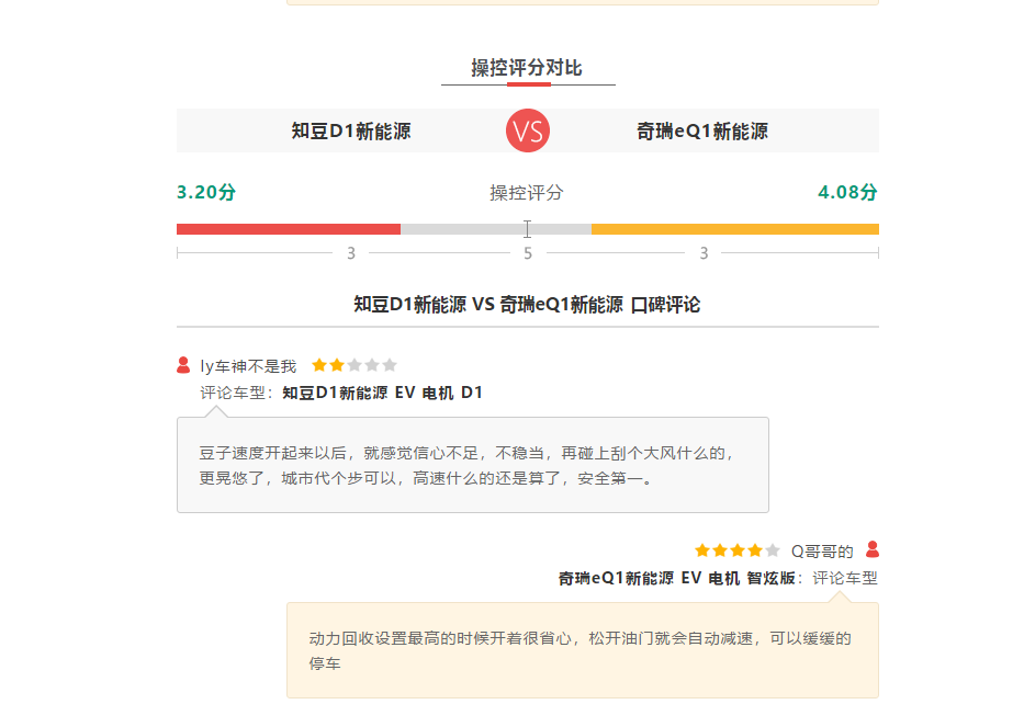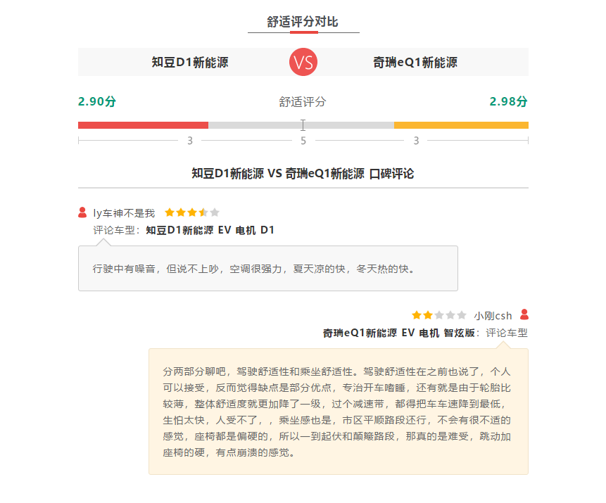大多数买过车的朋友都经历过在两车之间做选择题的体验,动力感受哪个好?这项新配置是否实用?后续保养哪个更省钱等问题也随之产生。这个时候参数表的意义已经不大,消费者更希望的是“老司机”来谈谈用车生活,因此口碑在购车时的参考价值变得越来越大。 本篇知豆D1新能源和奇瑞eQ1新能源的口碑对比文章,会在综合评分以及8个性能方面分析车主们的点评数据,包括:外观、空间、动力、油耗等并从中提炼特征标签和最终得分。对于还在两车之间纠结的朋友来说,最直观地了解两车各方面的优缺点从而缩短决策周期就是小编制作这期口碑对比的意义啦。下面让我们一起来看车主眼中的知豆D1新能源和奇瑞eQ1新能源究竟谁更胜一筹。 知豆D1新能源 VS 奇瑞eQ1新能源 口碑评论