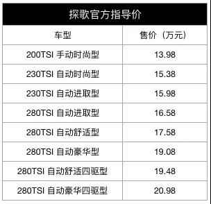 再把探歌全系售价贴上来,大家仔细看看。发现了没,13.98万的探歌两驱时尚版,不光是手动挡,还是系列唯一一款1.2T动力车型。