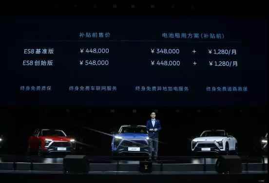 李斌的蔚来ES8基准版补贴前售价为44.8万元,限量1万辆的创始版补贴前售价为54.8万元。蔚来ES8本身具备换电模式,因此蔚来汽车在国内市场首开先河地提供了电池租用方案,购买不带电池的蔚来ES8可节省约10万元,但用户需每月支付1280元的电池使用费。