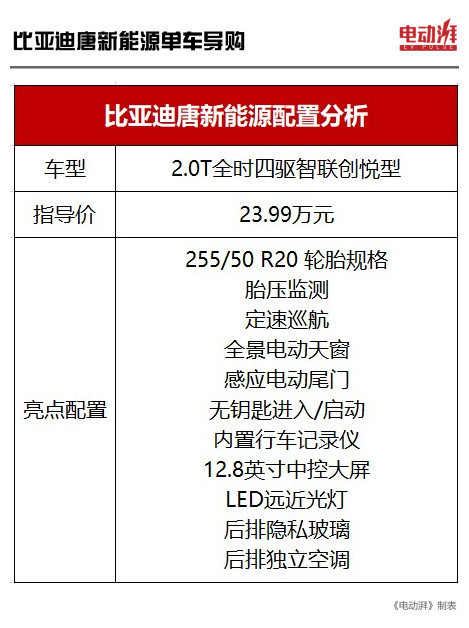最后湃客给出的全新一代比亚迪唐新能源购买推荐指数如上表所示。2.0T全时四驱智联创睿型是最值得购买的车型,2.0T全时四驱智联创享型其次。由于今年9月1日前订购中间三款车型的消费者都可获赠价值2万元的性能升级礼包,所以最低配和顶配车型都不推荐购买。